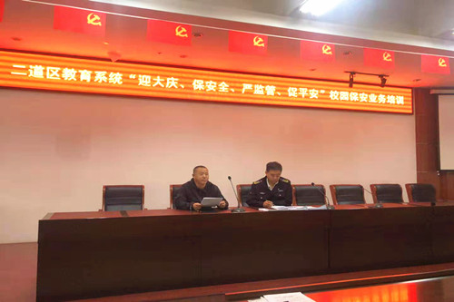 为深入贯彻落实2019年9月4日公安部、教育部视频会议精神,进一步加强中小学(幼儿园)安全管理工作,有效防范针对未成年学生和幼儿暴力伤害事件的发生,保护师生生命财产安全,依据国务院教育督导委员会办公室关于进一步加强中小学(幼儿园)安全工作的紧急通知要求,全面落实长春市学校(幼儿园)安全防范工作“十五条”硬性措施,9月22日上午,文教大队副大队长刘海波及驻二道区中小学校90名保安员参加了二道区教育局举行的“迎大庆、保安全、严监管、促平安”保安业务培训会。二道区教育局安全科相关领导、各中小学主管安全的副校长、教师参加了培训会。