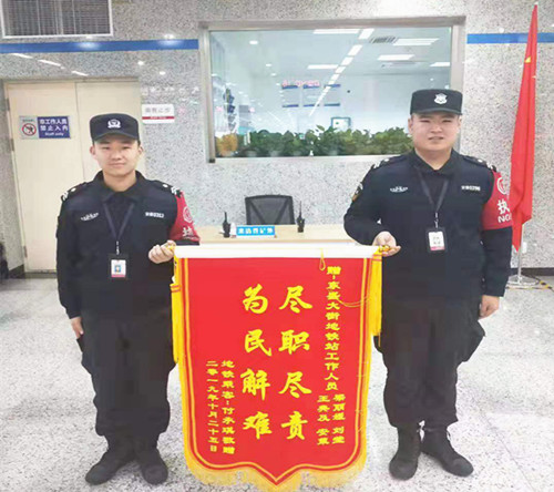 2019年10月26日下午,康复后的这名女乘客来到车站,专门为参与抢救她的安保班长王典政、安保员安策及其他站务人员送来一面锦旗,表示感谢。