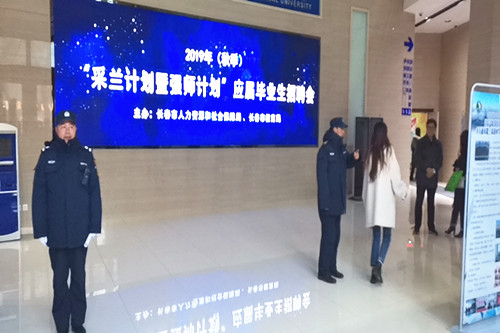 2019年11月4日,由长春市人力资源和社会保障局、长春市教育局主办的2019年(秋季)“彩兰计划暨强师计划”毕业生招聘会在东北师范大学体育馆举行。站前分公司驻东北师范大学15名保安员协助东北师范大学保卫处承担了此次招聘会安保任务。
