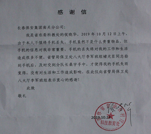 最近,南关分公司收到一封来自吉林省农业农村厅工作人员侯晓华的感谢信,侯晓华在信中感谢南关分公司驻省政府保安员褚光臣捡到自己手机并及时归。