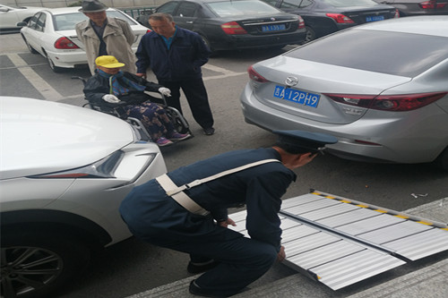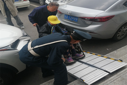 最近,金融大队驻中国银行保安员郭殿君在一次例行巡逻时,发现一位老大爷用轮椅推着行动不便的老大娘吃力地往银行走来。他上前询问,得知他们是来银行办理业务之后,为了帮助他们顺利通过银行前高高的四层台阶,他立即找来铝合金斜坡板,与老大爷一起把大娘推了上来。这感人的一幕,恰巧被银行行长发现并用手机拍摄了下来,并发到了银行工作群中,高度赞扬了郭殿君助人为乐的行为。
