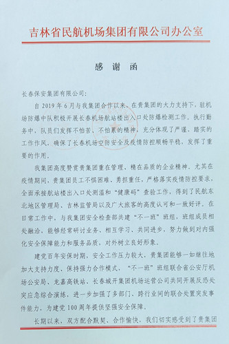 近日,长春龙嘉机场集团办公室主任王刚,龙嘉国际机场安全检查部总经理姜英民、副总经理贾东辉、安全检查部综合办主任栾家富、防爆科科长谭树军、防爆科助理张丹一行领导到访长春保安集团,为长春保安集团九台分公司驻长春龙嘉国际机场安检防爆队送感谢函。集团副总经理范胜田,九台分公司经理王永生及九台分公司驻龙嘉机场安检队队长宣凤林热情接待了来访领导。