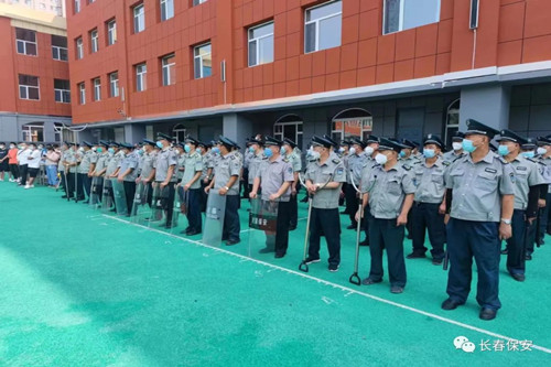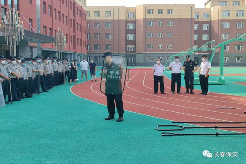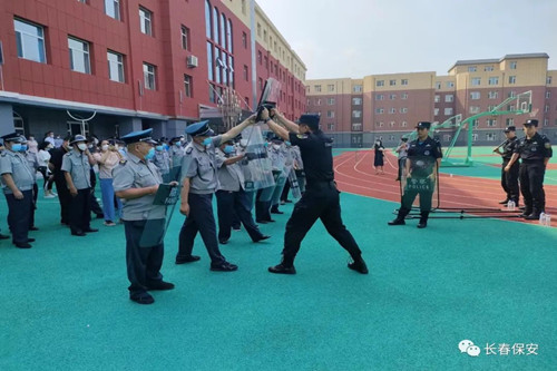 2022年7月26日上午,长春市宽城区教育局、长春市特警支队飓风中队、保安集团北湖分公司、保安集团培训学校联合在长春市七十二中学举办了宽城区2022年校园保安业务技能培训。宽城区下属各中小学教师、近100 名宽城区校园保安参加了本次培训。长春市宽城区教育局安全科科长周峰等领导、保安集团北湖分公司经理梁绍辉现场观摩了培训活动。