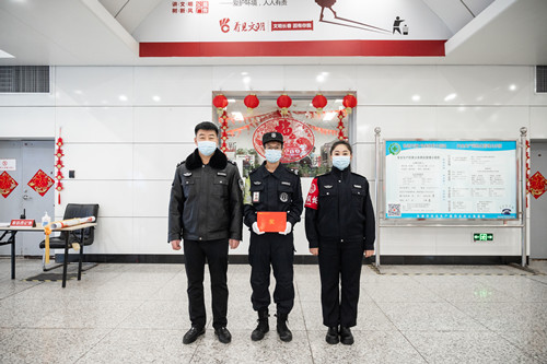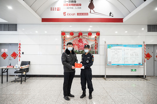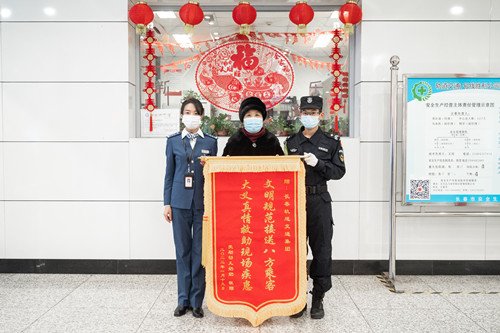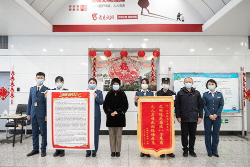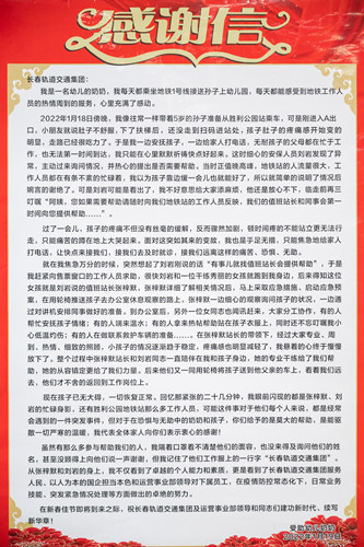 1月24日,一名乘客拿着锦旗和感谢信来到轨道交通1号线胜利公园站,对当日救助其孙子的工作人员表示感谢,并连连称赞工作人员给予的莫大帮助,对于当时处于恐惧与无助中的祖孙两人来说是能驱散一切严寒的温暖。