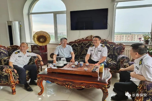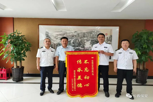 2022年7月5日上午,经开区兴隆山镇社会福利中心主任邓海踪到长春保安集团赠送锦旗表达谢意。长春保安集团党委书记、总经理公丕春,副总经理范胜田,总经理助理闫俊峰进行了热情接待.