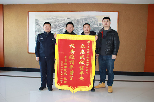 近日,长春市中医院保卫科科长周占宇、科员谷沛霖莅临长春保安集团,代表长春市中医院将一面印有“众志成城保平安,抗击疫情辛苦啦”的锦旗送到了长春保安集团宽城分公司经理黄继成、中队长洛家庆手中,对长春保安集团宽城分公司驻长春市中医院保安执勤队长期以来的安保工作和疫情防控工作给予充分肯定和高度赞扬。