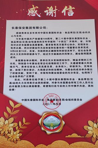 近日,长春农业博览园安保部部长陈扬莅临长春保安集团赠送荣誉证书和感谢信,对长春保安集团在第二十届长春国际农业•食品博览(交易)会安保工作中全力以赴、履职尽责、积极作为,保障农博会成功举办发挥的重要作用给予高度赞扬和衷心感谢。