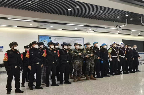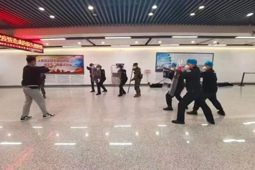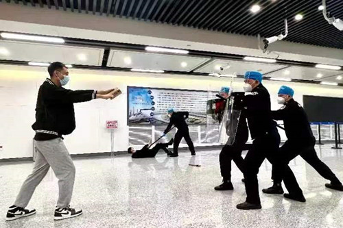 2022年9月23日下午,长春保安集团九台分公司驻龙嘉机场防暴检测中队联合机场特警、武警、城开、铁路多部门进行了防暴恐突发事件应急演练活动。驻勤保安员参加了演练。