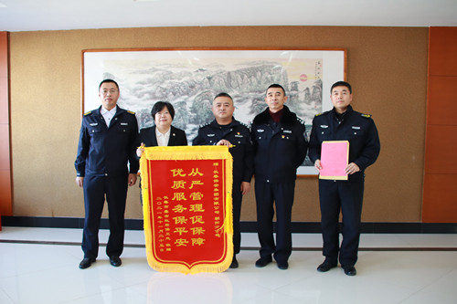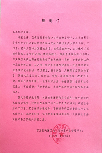 2021年11月26日上午,长春市委市政府机关事务管理局保卫处王处长、张副处长、郭科长一行领导到访长春保安集团,为长春保安集团朝阳分公司驻市直机关各集中办公区保安执勤队赠送锦旗和感谢信。集团总经理杨向荣、集团总经理助理兼朝阳分公司经理田红功热情接待了来访领导,双方进行了座谈。