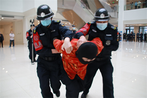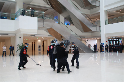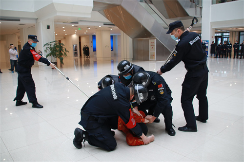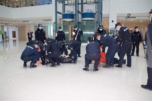 演练现场模拟一名暴徒和两名暴徒手持板斧、菜刀、砖头、匕首、铁棍等不同凶器,试图闯入市政府。执勤保安员及时发现情况,按照反恐突发事件应急预案开展处置:队长与暴徒沟通无果后,手持防暴盾牌、防暴钢叉组成防暴队形的保安员与隐藏防暴突击的保安员密切配合,成功将“暴徒”制服并快速带离现场。整个演练过程紧张有序、衔接顺畅,参与人员分工明确、行动迅速。演练真实性、实战性强,起到了以实战促实训的训练效果,获得了市委、市政府各级领导充分肯定和高度评价。